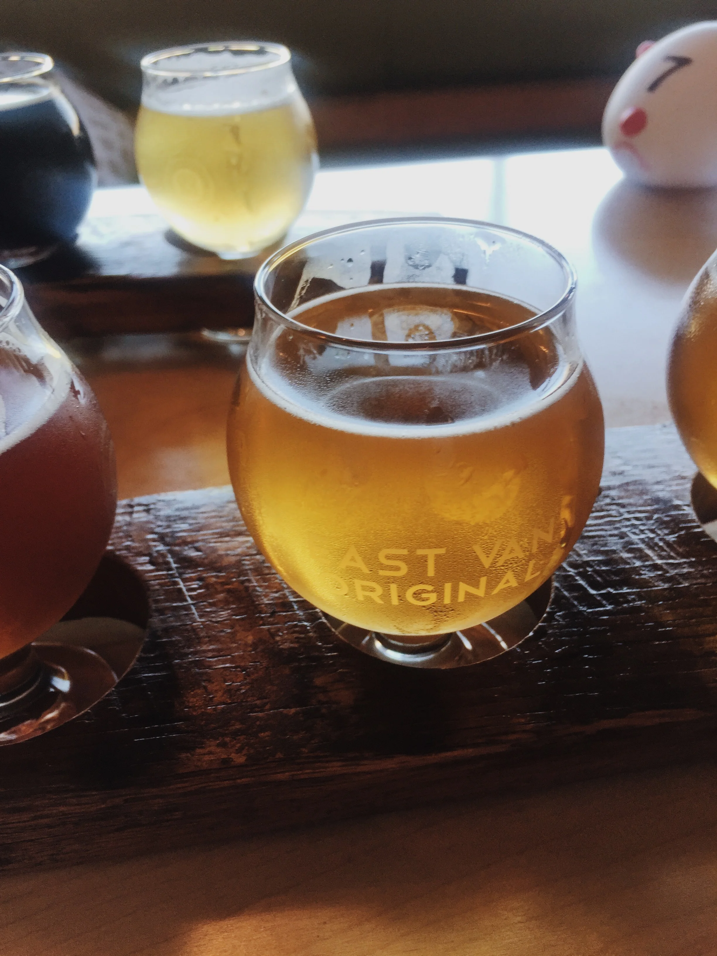 Most breweries will have 2-3 sizes of glasses they serve the beer in, and the best way to try is to get a flight, which is usually 4 little tasting beers in a wooden bat of some sort. Again, you can ask to try the beer before you get a full glass of it, even the little glasses for your flight. A flight is the most fun way to drink at a brewery, and lets you try variety of the beers, and is great for someone who doesn't want to commit to a full pint or something big like that.