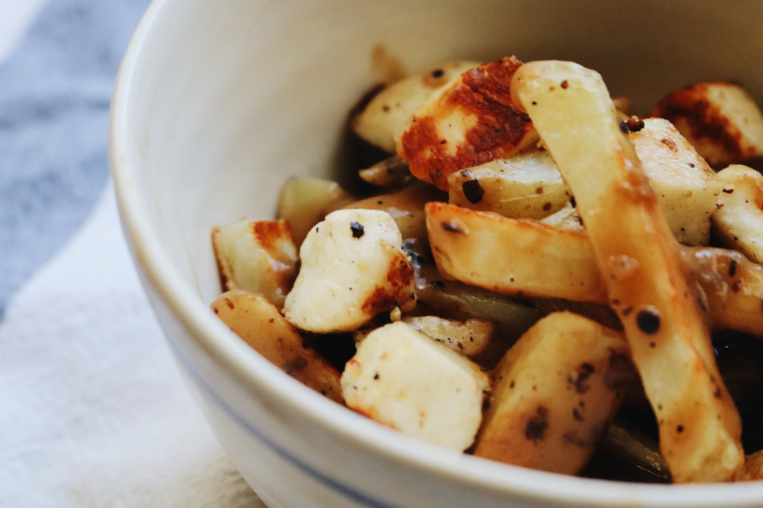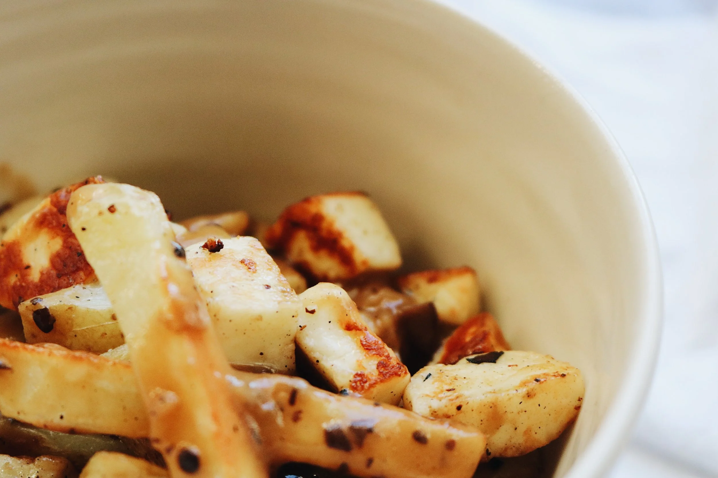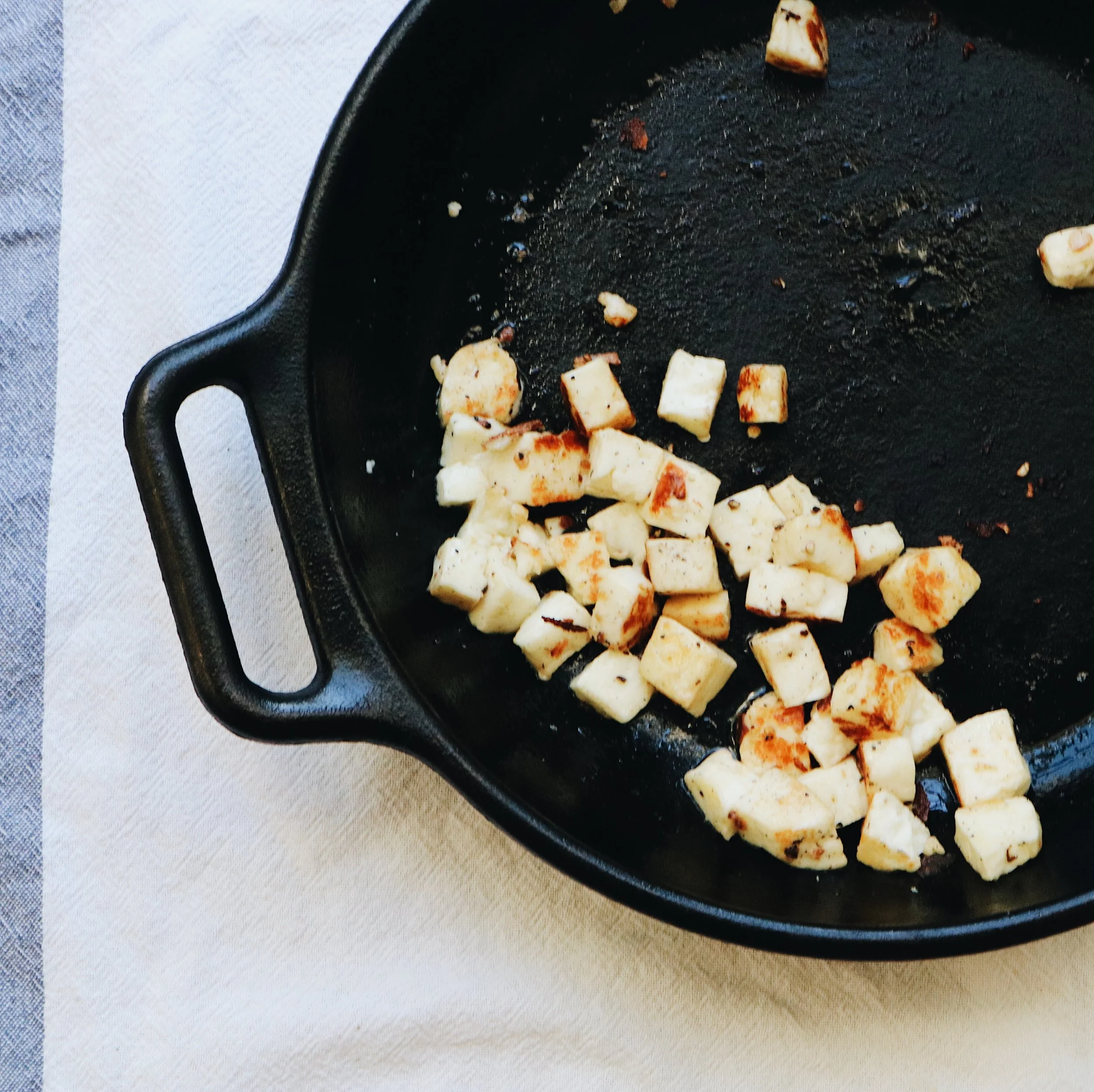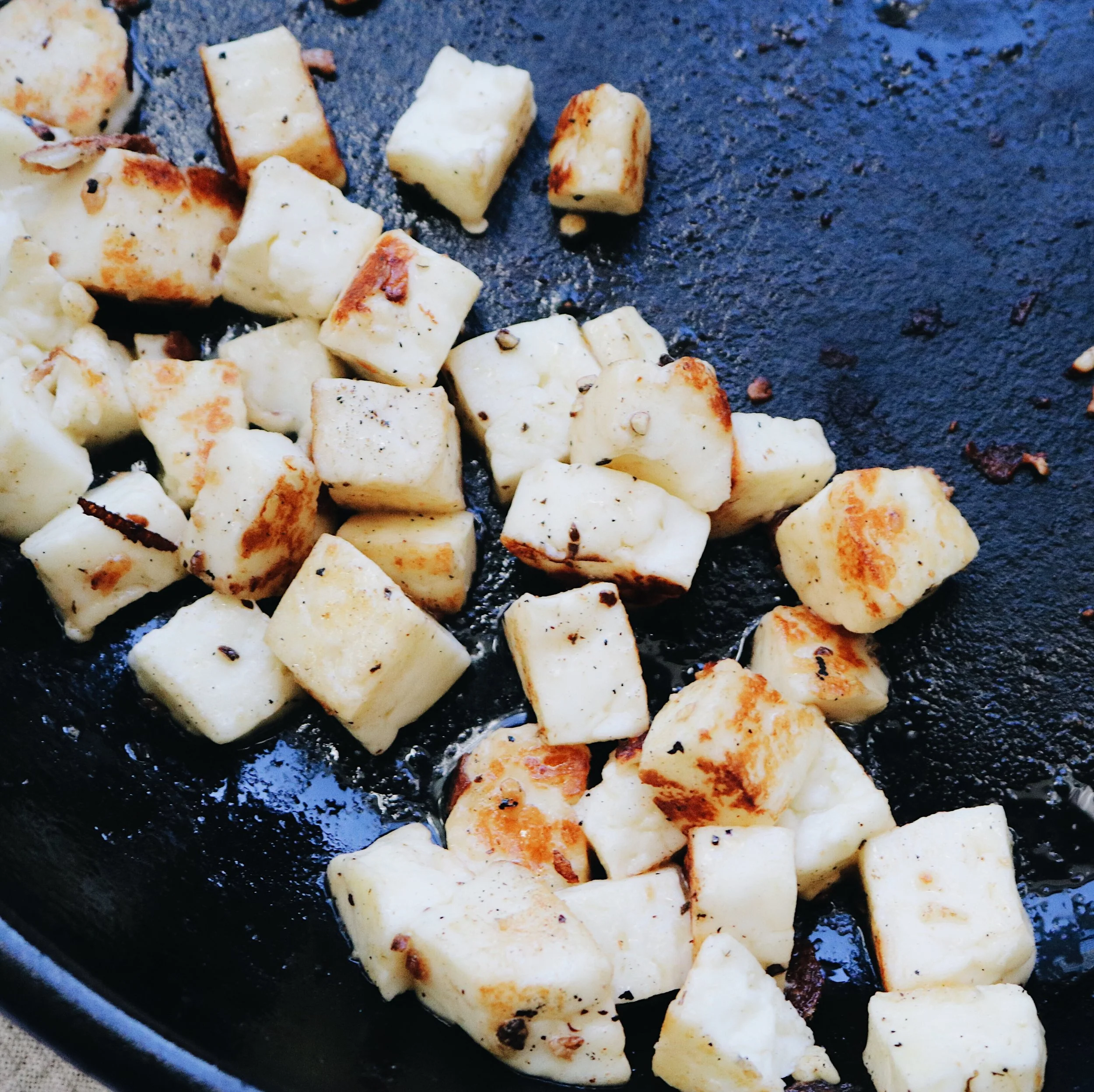 Chop up your halloumi into cheese-curd sized pieces, toss with some olive oil + salt + pepper + fry that shit up so it's nice + golden brown + incredibly delicious.