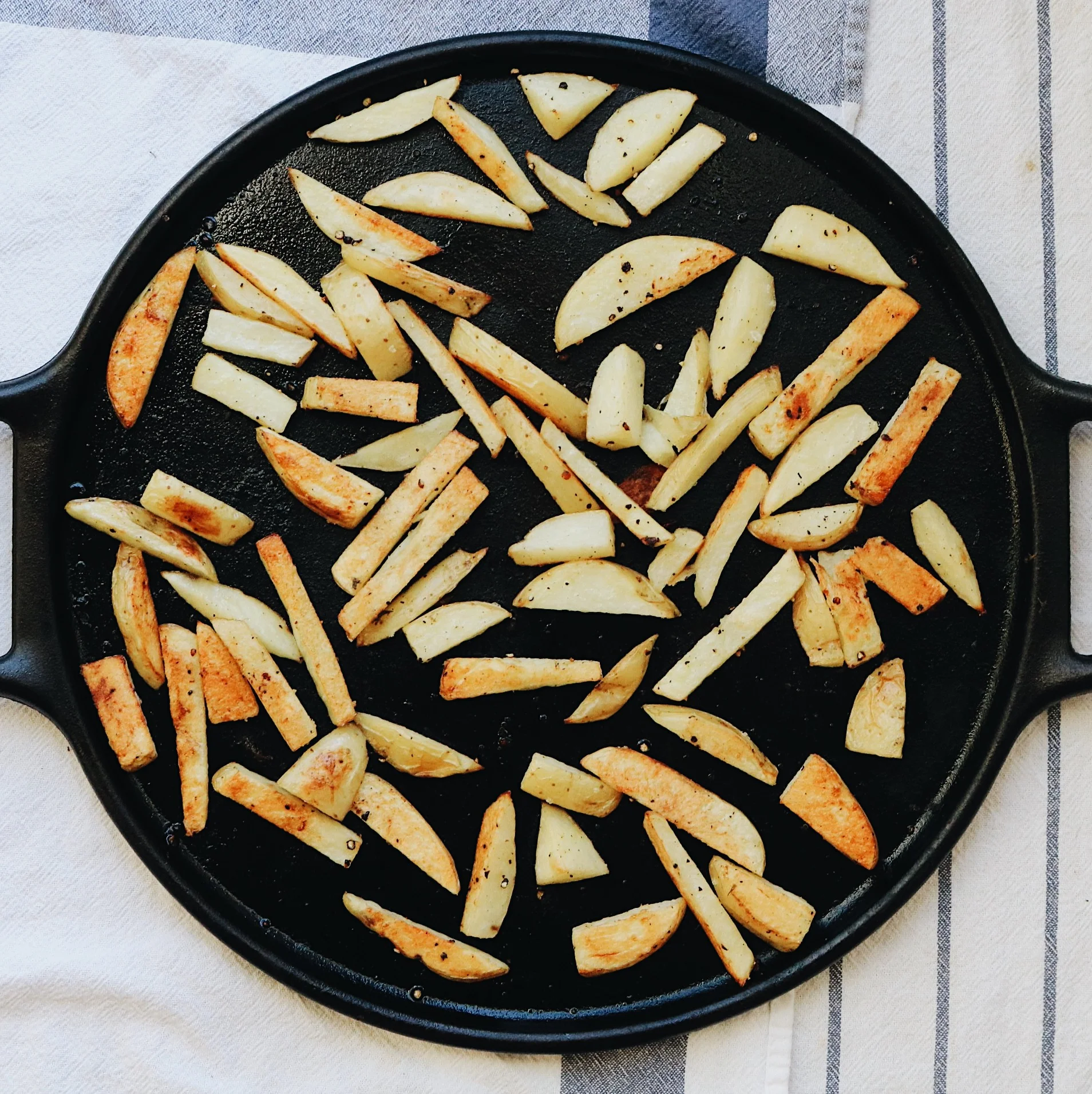 Switched over to this recipe for sweet potato fries, and saw that basically you preheat the oven to 450 F // cut spuds into french fry shape + size // dry them with a paper towel // toss them in oil + pepper + salt // bake them on one layer thick not touching each other cast iron pizza stone // flip after 20 minutes // bake again for 10 and you done!