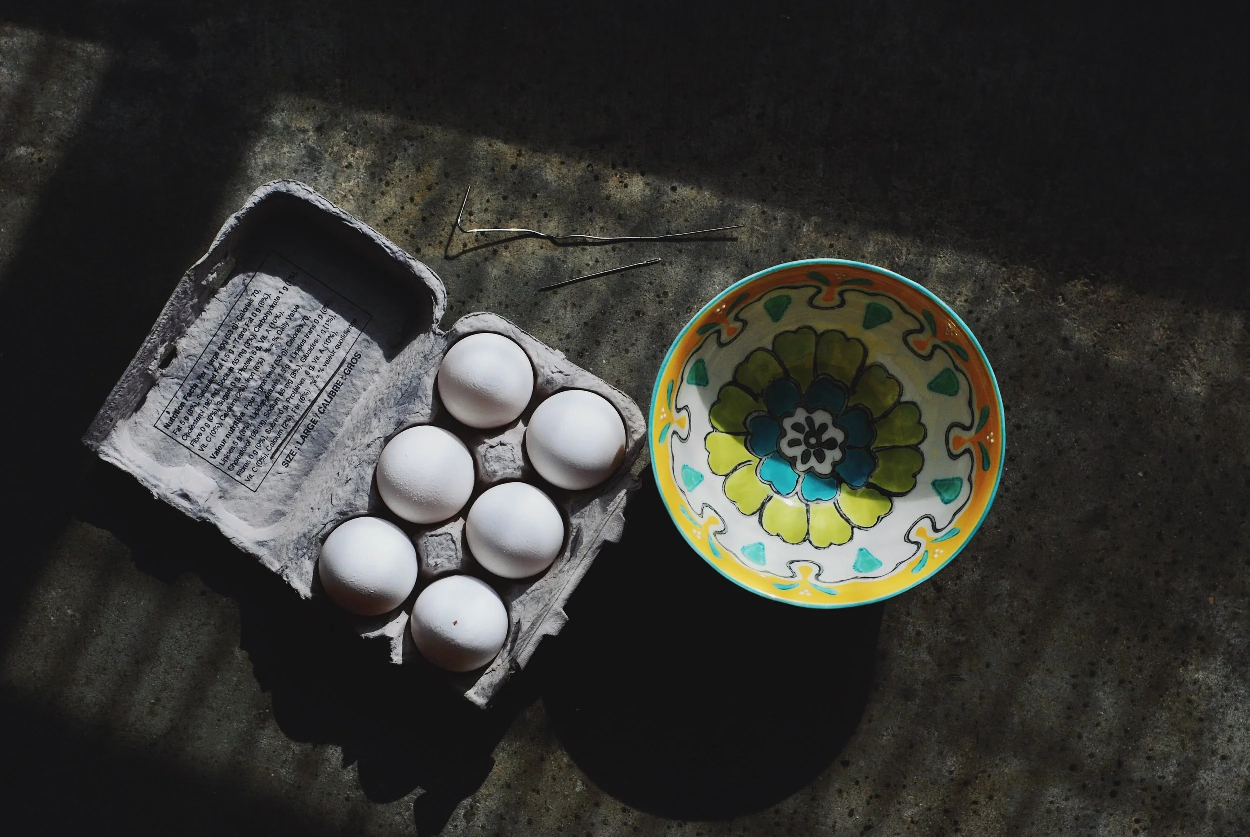 I decided I was going to try blowing out an egg for the first time so, suspicious that the egg was going to shatter + splatter my entire house with egg goo, I set up on the cement floor + got the doggy cleanup crew in position. As it turns out, other than being time consuming it's a pretty easy thing to do and you probably already have the stuff at home to do it.