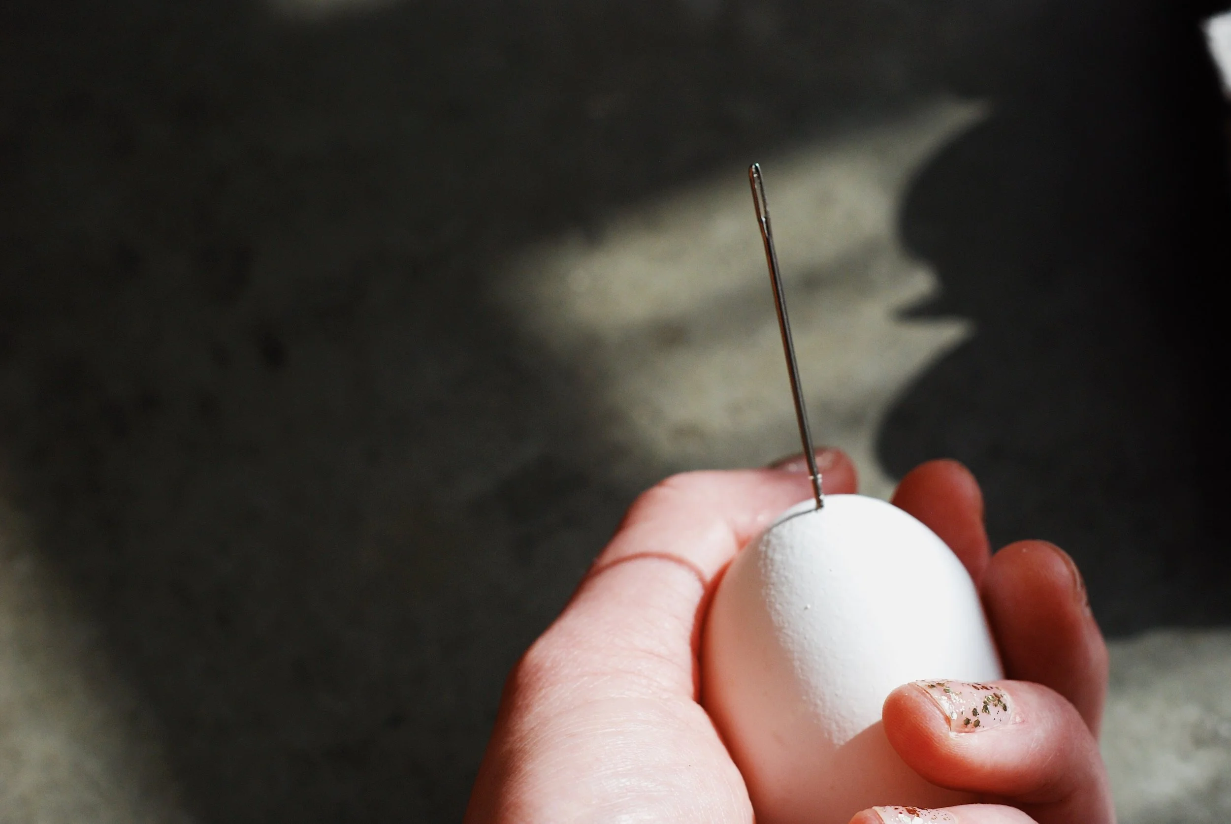 Poke the needle into the pointy end of the egg. Poke around that hole a few times to make the hole bigger.