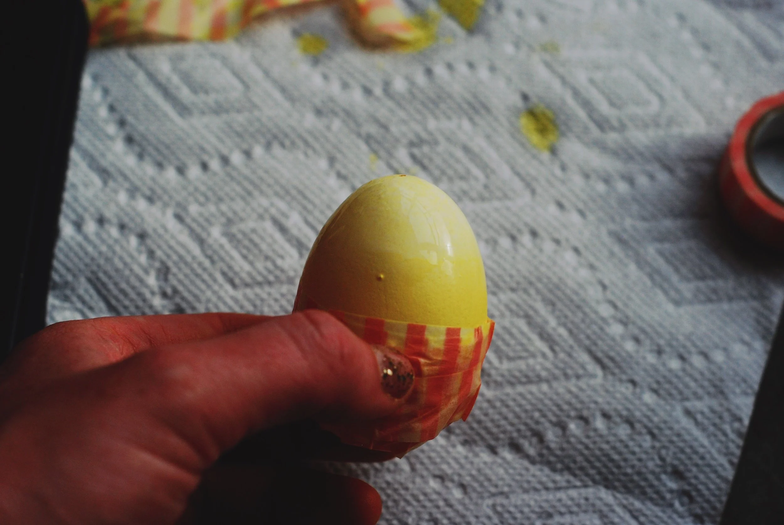 Wrap the egg in masking or washi tape, really tight with lots of layers. This is when I keep saying I know it's a kid's craft, but damn I had a hard time getting a good seal on that tape.