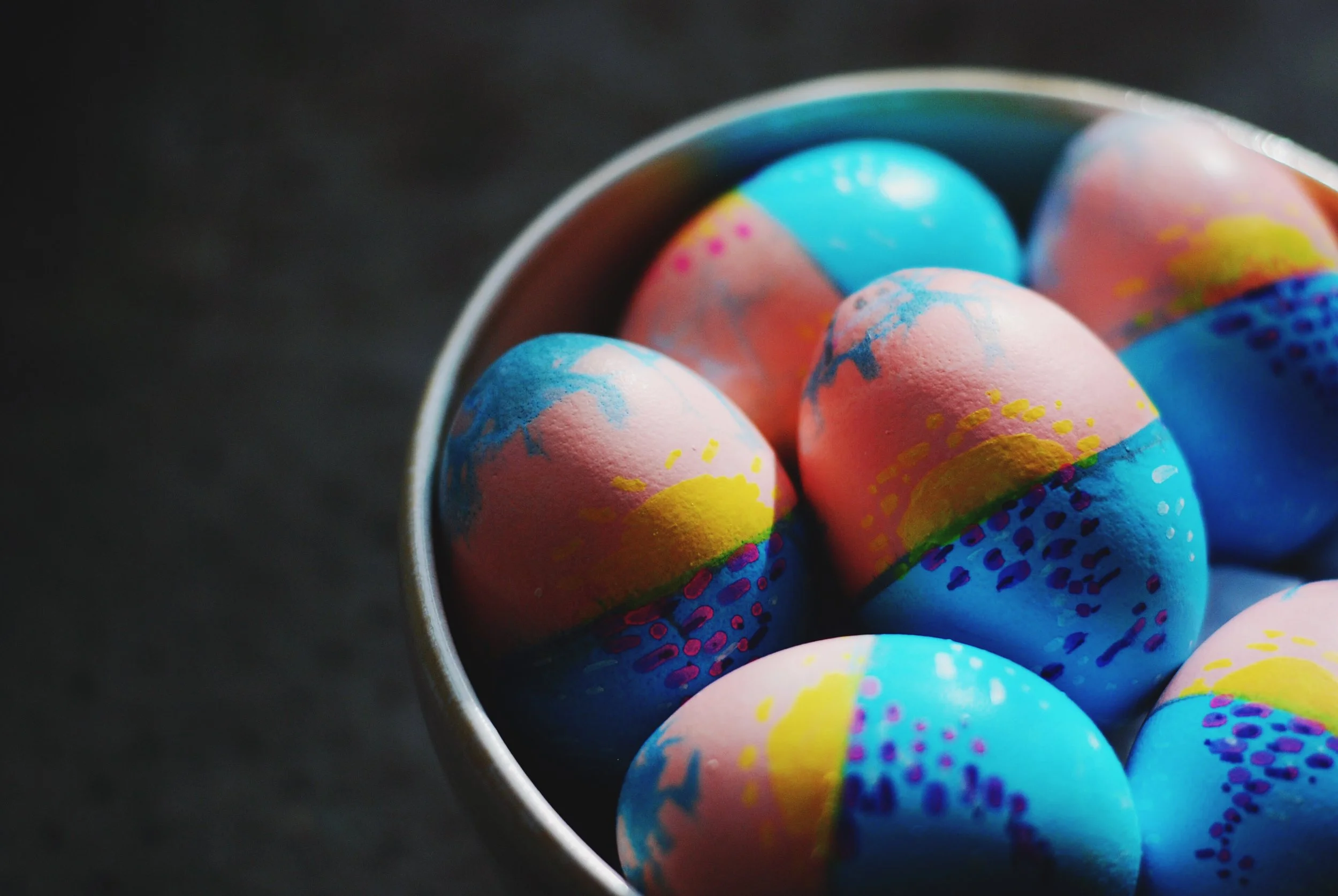 On the yellow egg I used yellow for the sun, gold for the reflection, and white for the waves. The pink ones I used pink + purple instead of gold. I'm not the best at drawing, so I try to keep things pretty simple. I created a half circle of yellow for the sun and made a bit of blur around the edges + drew some rays. I used dots and dashes in white along the bottom of the egg + randomly around the sides, and the gold // pink in dashes in a tapering pattern + added purple dots onto the edges of the pink dashes.