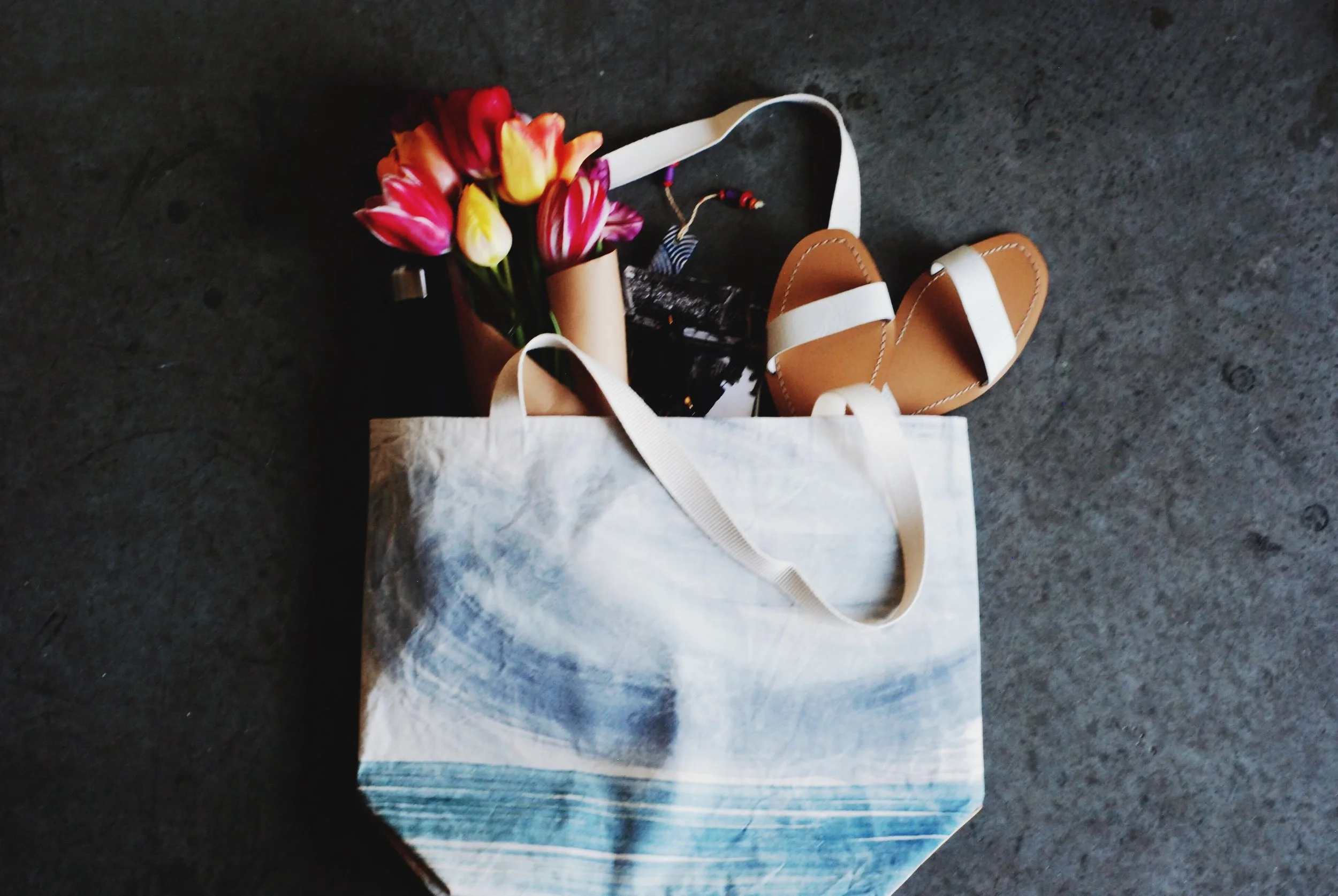 I'm packing mine with a denim jacket, a change of shoes, a water bottle, a book with my Ugandian Fair Trade bookmark, my camera, a granola bar, grapes + sunglasses to head up to the park this summer.